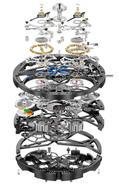 碳纤维表壳,搭配嵌衬橡胶的钛合金表环 玫瑰金表圈,搭配漆面时标和覆有防眩涂层的蓝宝石水晶玻璃 黑色DLC涂层钛合金透视表背,搭配蓝宝石水晶玻璃 橡胶表冠,搭配玫瑰金冠盖
