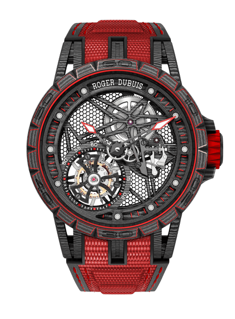 首款配备碳纤维结构且获得日内瓦印记认证的机芯。 该技术通过精心研发得以突破界限,采用复层碳纤维制造陀飞轮上部框架以减轻重量,也将动力储存提升为90小时。 飞行陀飞轮由Roger Dubuis罗杰杜彼的日内瓦工坊制造,体现Roger Dubuis罗杰杜彼卓越制表师们的精湛技艺。