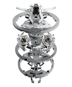 机芯被设计成犹如Lamborghini Squadra Corse兰博基尼赛事运动部构思出的超级跑车引擎一般。 V字形幾何造型、90度倾斜配置的双飞行陀飞轮。