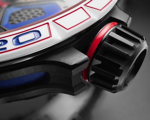 蓝色下层盘缘,搭配转印字样和分钟圈;白色上层盘缘,搭配填充SLN夜光涂料的镀铑螺丝式时标