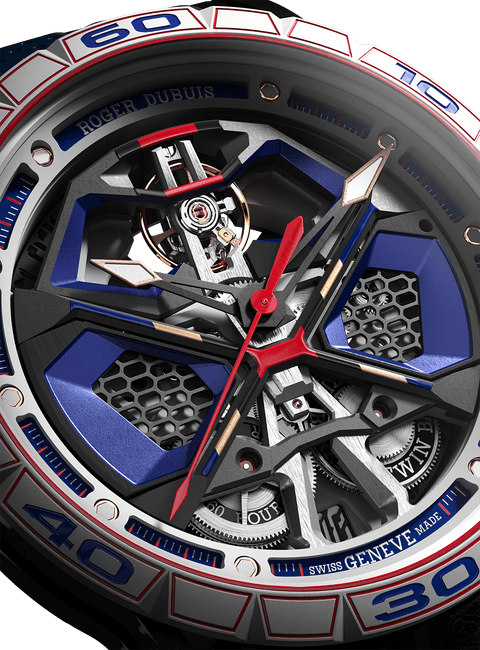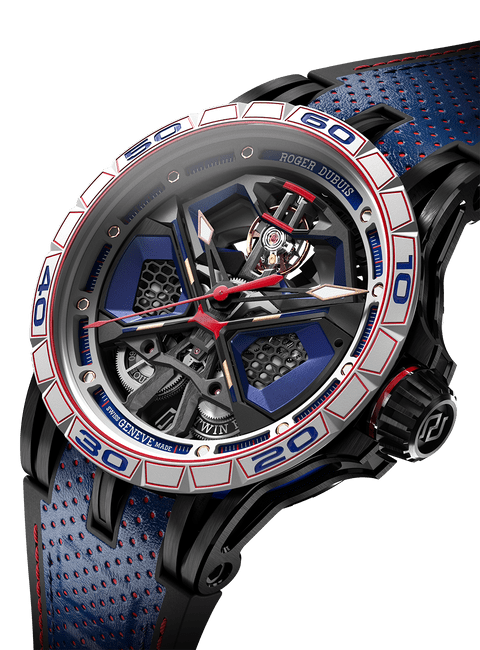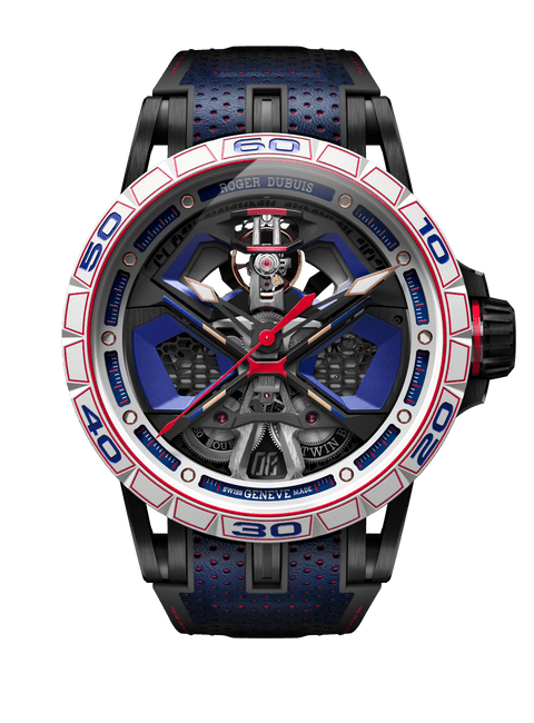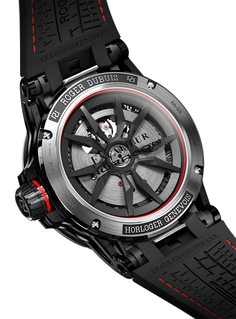 黑色DLC涂层钛合金表壳 白色MCF(矿物复合纤维材质)表圈,搭配漆面时标和覆有防眩涂层的蓝宝石水晶玻璃 钛合金透视表背,搭配蓝宝石水晶玻璃和金属镌刻Excalibur Huracàn标志 黑色DLC涂层钛合金表冠,搭配红色漆面环圈