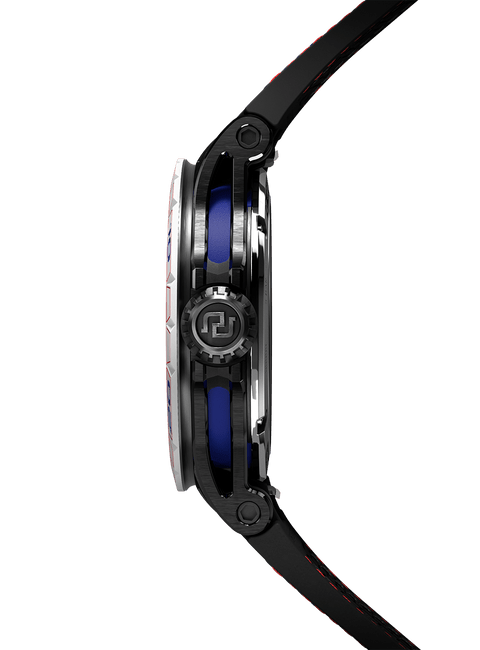 黑色橡胶表带,嵌衬蓝色穿孔小牛皮,孔洞内部为红色;配备快拆装置,易于迅速更换