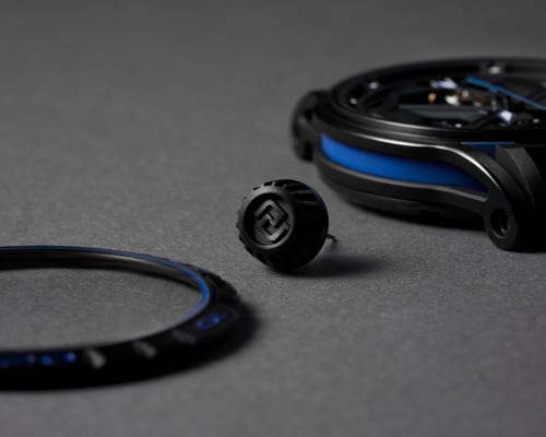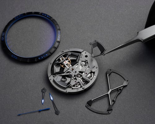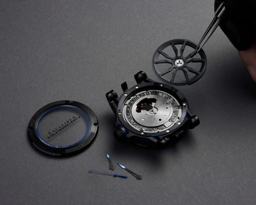 黑色DLC涂层钛合金表壳,搭配嵌衬橡胶的钛合金表环 黑色DLC涂层钛合金表圈,搭配漆面时标和覆有防眩涂层的蓝宝石水晶玻璃 黑色DLC涂层钛合金透视表背,搭配蓝宝石水晶玻璃和金属镌刻Excalibur Huracàn标志 黑色DLC涂层钛合金表冠,搭配漆面环圈
