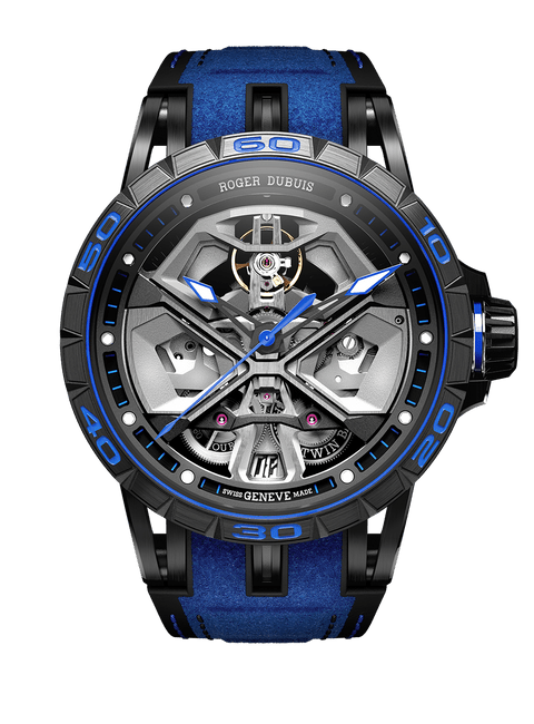 黑色橡胶表带,内部嵌衬蓝色Alcantara®欧缔兰材质;橡胶饰有蓝色缝线,Alcantara®欧缔兰材质则饰有黑色缝线;背面内衬饰有Roger Dubuis罗杰杜彼标志图纹;配备快拆装置,易于迅速更换