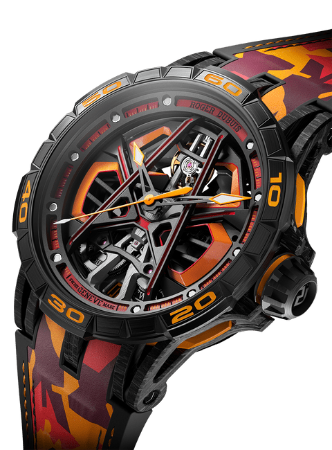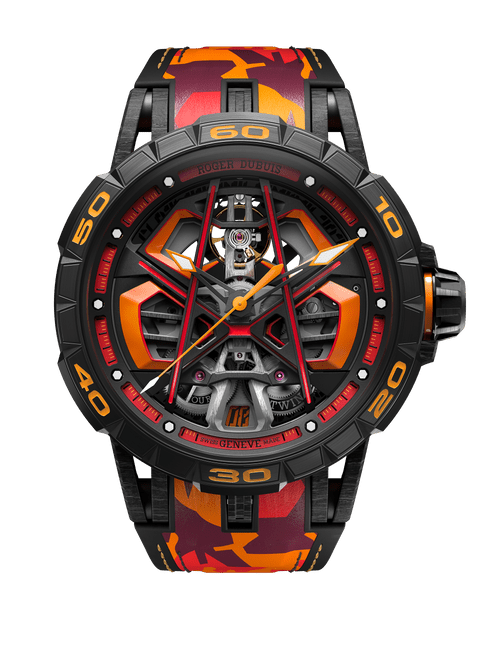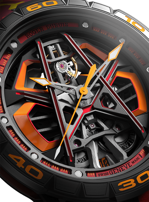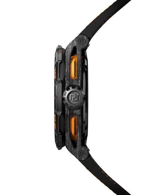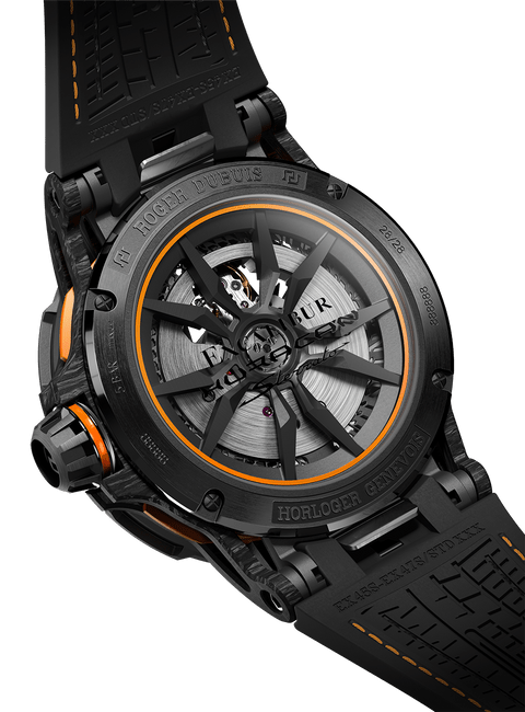 碳纤维表壳 黑色DLC涂层钛合金表圈,搭配漆面时标和覆有防眩涂层的蓝宝石水晶玻璃 黑色DLC涂层钛合金透视表背,搭配蓝宝石水晶玻璃和金属镌刻Excalibur Huracàn标志 黑色DLC涂层钛合金表冠,搭配橙色漆面环圈