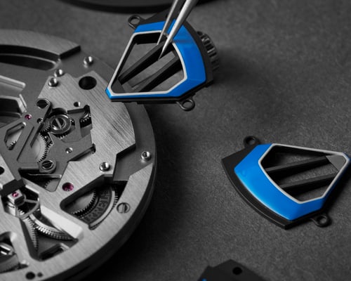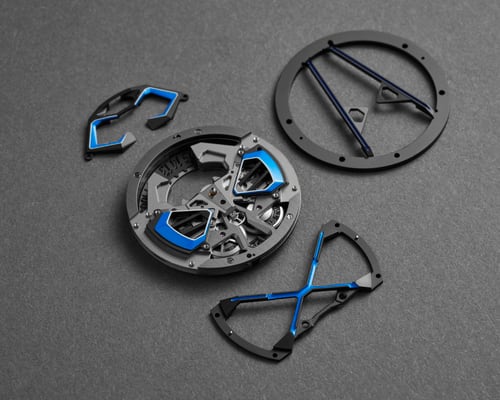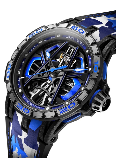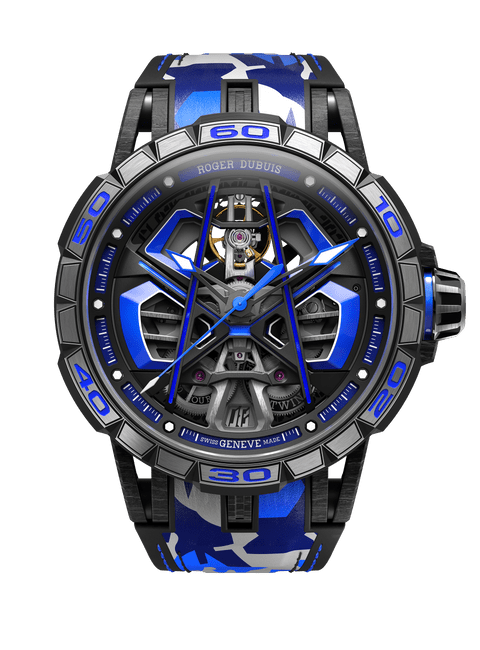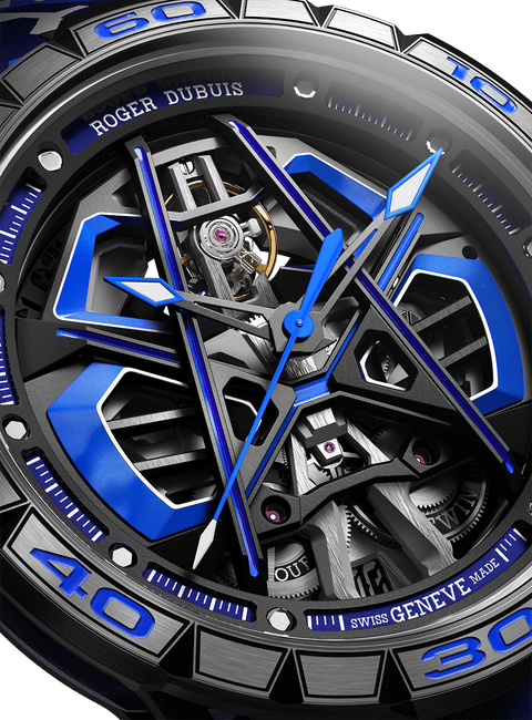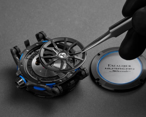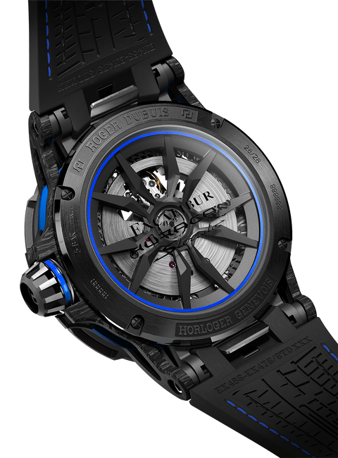碳纤维表壳 钛合金表圈,搭配漆面时标和覆有防眩涂层的蓝宝石水晶玻璃 黑色DLC涂层钛合金透视表背,搭配蓝宝石水晶玻璃和金属镌刻Excalibur Huracàn标志 黑色DLC涂层钛合金表冠,搭配蓝色漆面环圈