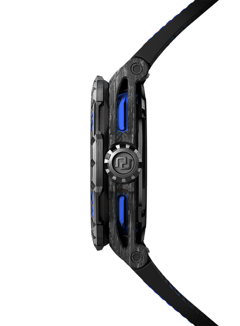 表壳臻选 SMC 碳纤维制成,搭配黑色 DLC 表圈,缔造卓绝性能,同时确保佩戴舒适。