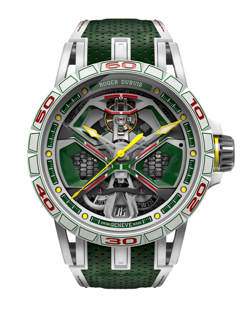 白色MCF(矿物复合纤维材质)表壳,搭配嵌衬绿色橡胶的钛合金表环 白色MCF(矿物复合纤维材质)表圈,搭配漆面时标和覆有防眩涂层的蓝宝石水晶玻璃 钛合金透视表背,搭配蓝宝石水晶玻璃和金属镌刻Excalibur Huracàn标志 钛合金表冠,搭配漆面环圈