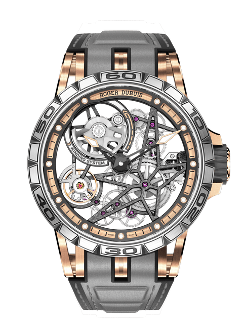 类型:Excalibur Spider系列镂空表壳 直径:45毫米 材质:18K玫瑰金表壳,搭配钛合金表环,覆有黑色橡胶涂层 表圈:钛合金表圈,搭配黑色标记 表冠:钛合金表冠,覆有黑色橡胶涂层,搭配18K玫瑰金冠盖 表镜:覆有防眩涂层的蓝宝石水晶镜面 表背:钛合金表背,搭配蓝宝石水晶镜面