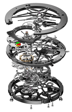 镂空飞行陀飞轮机芯,体现Roger Dubuis罗杰杜彼卓越制表师们的精湛技艺 飞行陀飞轮设于7点钟位置,每60秒旋转一圈 机芯的设计灵感来自汽车世界,因此配备形似汽车油表的动力储存显示器