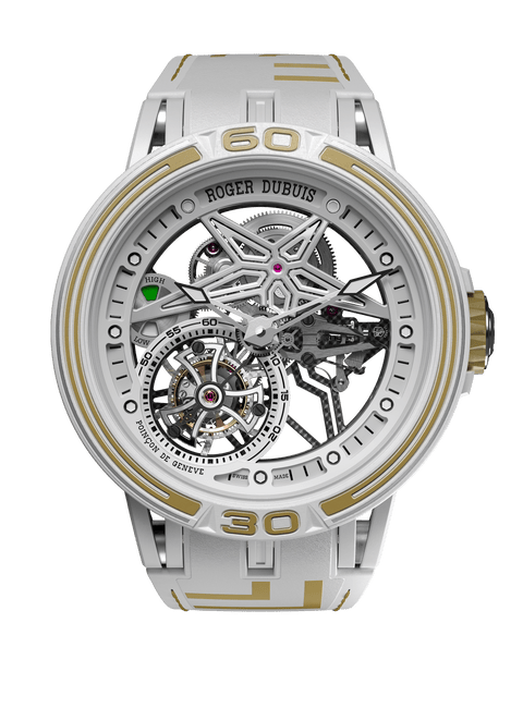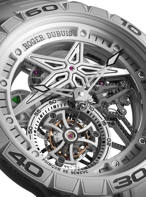 镂空飞行陀飞轮机芯,体现Roger Dubuis罗杰杜彼卓越制表师们的精湛技艺 飞行陀飞轮设于7点钟位置,每60秒旋转一圈 机芯的设计灵感来自汽车世界,因此配备形似汽车油表的动力储存显示器