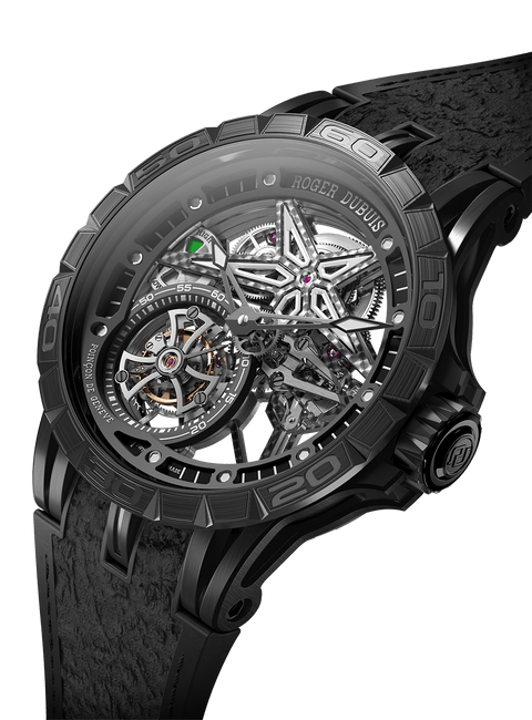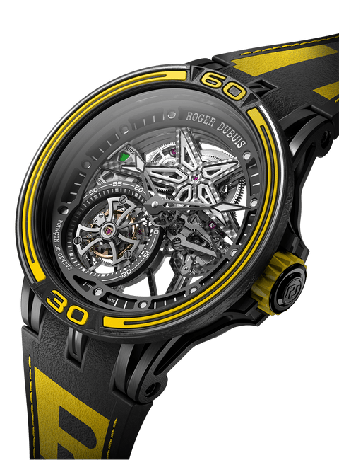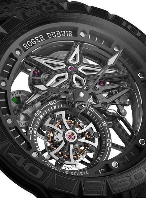 镂空飞行陀飞轮机芯,体现Roger Dubuis罗杰杜彼卓越制表师们的精湛技艺 飞行陀飞轮设于7点钟位置,每60秒旋转一圈 机芯的设计灵感来自汽车世界,因此配备形似汽车油表的动力储存显示器