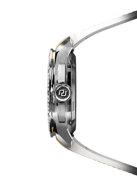 双材质表带,橡胶表框内部嵌衬小牛皮;配备快拆装置,易于迅速更换