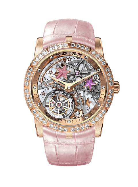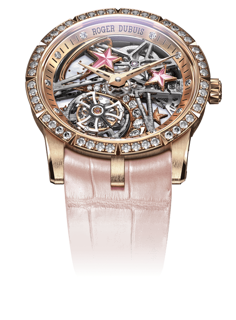 Excalibur 36腕表是新一代的小尺寸镂空飞行陀飞轮时计,精湛体现了Roger Dubuis罗杰杜彼打造奇迹的非凡能力。尽管尺寸小巧,此表款仍然搭载着大胆创新、具有高技术性的机芯。技艺卓绝的Roger Dubuis罗杰杜彼制表师们竭力研发出小型陀飞轮,是市场上极为罕见的创作之一。此机械装置悬挂于有一颗流星划过的夜空背景中,流星尾部上下飞梭于机芯桥板之间。流星本身以雕刻珐琅制成,为整个装饰带来光辉与深度。Excalibur Shooting Star腕表上镶嵌的钻石也为整体增添璀璨光芒,并与流星相互辉映。