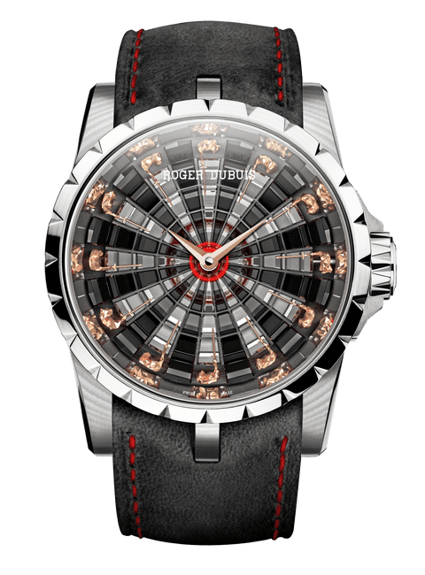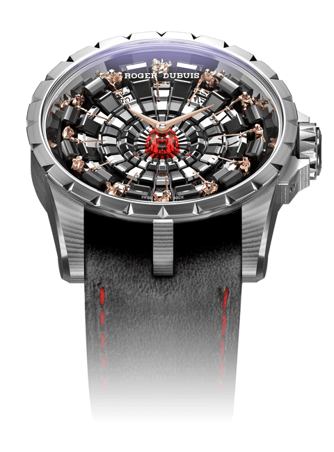 Excalibur Knights of the Round Table圆桌骑士腕表竭力追求将卓绝技艺展现于时计创作的所有层面:设计、技术和独创性。此表款的正面具有十分独特而醒目的设计:12个微型骑士雕塑围绕着圆桌表盘而排列。这些以手工制作的骑士代表着参与寻找圣杯任务的12位人物。圆桌以宝石或贵重材质或需要采用独特技术的材质而制成,象征着骑士们的团结与平等。此腕表搭载着Roger Dubuis罗杰杜彼自制的自动上链机芯且获得日内瓦印记认证,此乃高级钟表界最严谨的品质认证之一。Excalibur Knights of the Round Table圆桌骑士腕表为限量版作品,仅在特选的发行网络中销售。