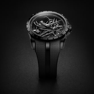 在日内瓦 Roger Dubuis 制造的镂空机芯是 Excalibur 系列富有表现力的独特性的精髓。 Excalibur 手表符合高级钟表最受尊敬的认证之一——日内瓦印记 (Poinçon de Genève),其设计就像当代艺术品。