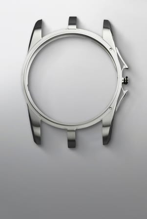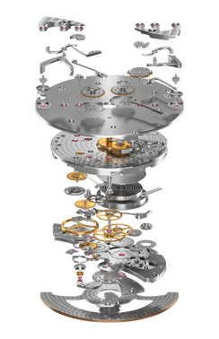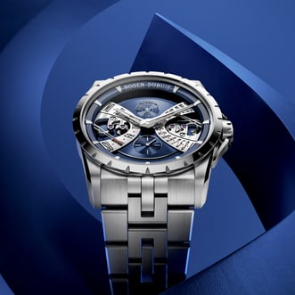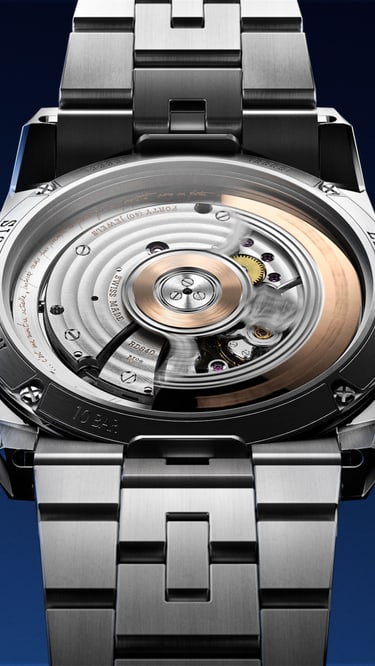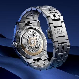 316L精钢构成了这款时计的整个表壳和表链,通过三种独特的润饰技术,展现其深邃的魅力。抛光、喷砂和缎面拉丝工艺巧妙结合,营造出对比鲜明的表面效果,捕捉并折射腕间光线。表壳内含七个独特的表盘层:寰宇蓝双层盘缘、逆跳刻度盘饰以太阳纹润饰并采用镀铑涂层、中央主夹板经环形拉丝处理、以及透过开放式表盘架构清晰可见的镂空机芯。对于品牌而言,精钢材质在此被充分发挥其在耐用性、凝聚力和抛光深度方面的潜力。