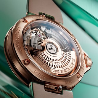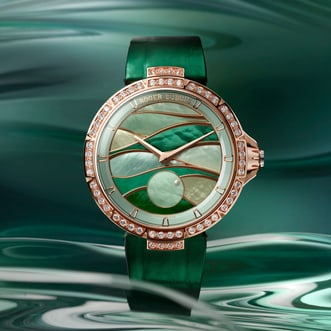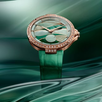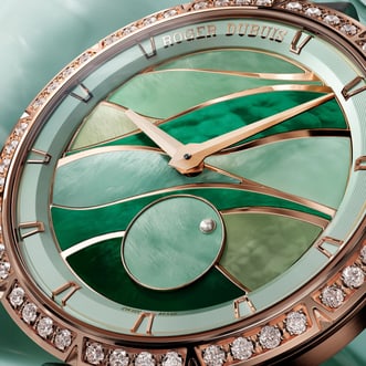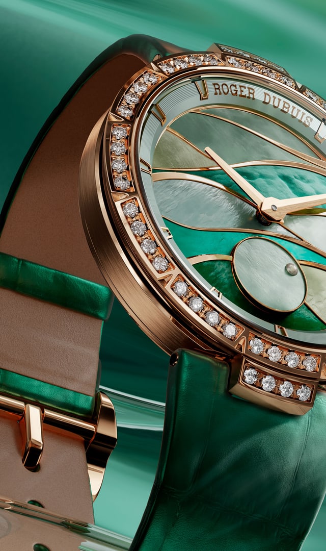 36毫米玫瑰金表壳,环抱一枚在纹理与深邃之间流转的表盘。绿色珍珠母贝碎片,每一片都以不同色调漆面处理,手工镶嵌于黄铜铣削而成的波浪形单元中,其轮廓经过抛光并以玫瑰金处理。表盘表面如布罗塞利昂湖水般起伏,在不同角度捕捉光线,呈现千变万化的光影。12点钟位置,Roger Dubuis字样以玫瑰金转印并粉饰。双面法兰盘上,玫瑰金时标与绿色CVD处理表面形成鲜明对比,中央饰以淡绿色漆面。6点钟位置,一颗月光石半球坐落于旋转的珍珠母贝圆盘之上,指示小秒:象征着表面与深层奥秘之间的通道。森林绿小羊皮表带,以其珠光质感,完美诠释了整体构图。