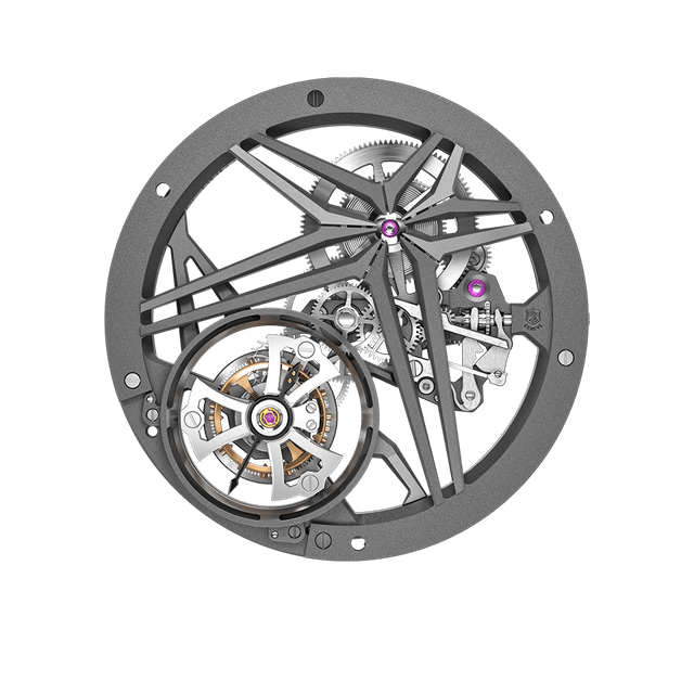陀飞轮被认为是制表界的巨大挑战之一。我们采用独创风格,在镂空机芯内展示这一繁复精美的机械装置。这一工艺更加耗时,需要超凡娴熟的专业技艺,方可造就简约不羁的外观。