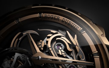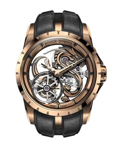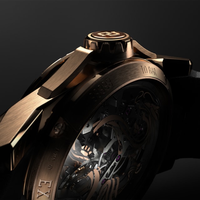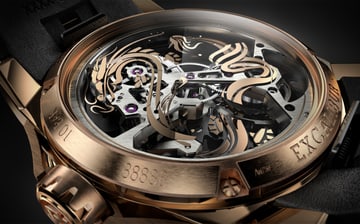 27 件龙型组件由黄铜制成,侧面饰以黑色亮漆,并以玫瑰金装饰抛光表面。25 个不同的表面营造出别具一格的 3D 立体效果。腕表背面的蓝宝石底盖内侧,饰以另一条由金属涂层绘就的神龙。