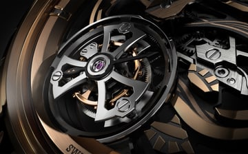 RD512SQ 机芯搭载出众的 72 小时动力储存。飞行陀飞轮的上半部分笼形框架由无磁的镜面抛光钴铬合金制成,下半部分则采用同样无磁的钛金属,重量比不锈钢轻两倍,可减轻腕表周围力的影响。