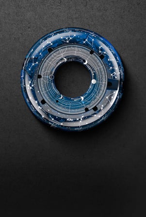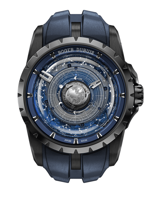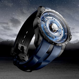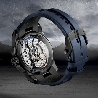秉承品牌复杂而富有创意的表盘传统,Excalibur Moonlight以四层结构呈现时间。外圈的CVD蓝色黄铜法兰圈承载着镀铑镶贴时标,并填充黑色Super-LumiNova夜光涂层。其上方,一个半透明的穆拉诺风格蓝色玻璃小时盘旋转,描绘了十二个黄道星座的星辰,每个星座都完整命名。第二个旋转盘,即分钟盘,以月相的夜光呈现延伸了星体图案。在第四层,一个雕刻有月球土壤纹理的贴花,为一分钟陀飞轮框架加冕,随秒律动。