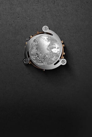 Excalibur Moonlight的核心跳动着RD115机芯,这是一款经Poinçon de Genève认证的中央飞行陀飞轮机芯。将调速机构置于机芯正中央,需要对显示和传动轮系进行彻底的重新思考。在此过程中,共申请了两项专利。第一项专利保护了一种紧凑的行星差速齿轮系,它能保持发条盒与陀飞轮框架之间的传动效率,在72小时动力储存内维持稳定的摆幅。第二项专利涵盖了一种基于夹扣的离合器释放系统,通过表壳侧面的按钮触发,用于分离旋转盘以进行时间设置。4点钟位置的小旗指示上链(W)或设置(S)模式。